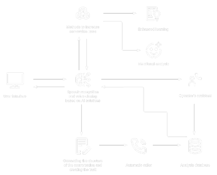 Automated callerThe main capability of the system is making thousands of phone calls in English, Spanish, and German languages, analyzing the context of the conversation, and responding accurately, with real-time emotional and context-based adjustments.